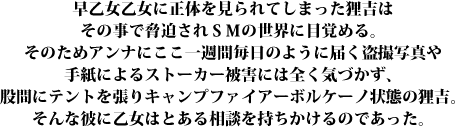 早乙女乙女に正体を見られてしまった狸吉はその事で脅迫されSMの世界に目覚める。そのためアンナにここ一週間毎日のように届く盗撮写真や手紙によるストーカー被害には全く気づかず、股間にテントを張りキャンプファイアーボルケーノ状態の狸吉。そんな彼に乙女はとある相談を持ちかけるのであった。